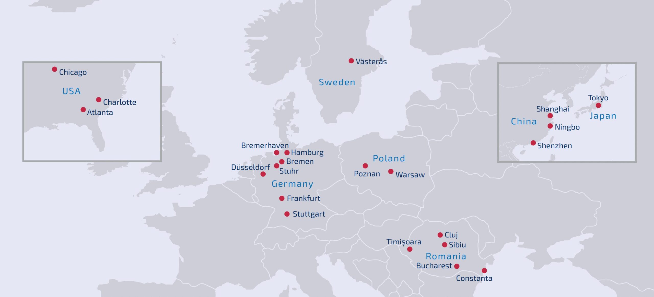 現在、ドイツ国内のブレーメン、ハンブルク、デュッセルドルフ、フランクフルト、シュトゥットガルト、ブレーマーハーフェンをはじめ、スウェーデン、ポーランド、ルーマニア、ハンガリー、日本、中国、アメリカといった海外にも拠点を展開しており、約510名のスタッフが世界中で活躍しています。これらすべての拠点は、Interfracht Speditions-Gesellschaft GmbH & Co. KGの管理のもと、グローバルに連携した輸送サービスを提供しています。